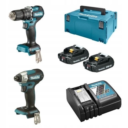 Zestaw COMBO narzędzi akumulatorowych 18V marki Makita składający się z wkrętarki udarowej DTD157, 2-biegowej wiertarko-wkrętarki DHP487, 2 akumulatorów 2Ah BL1820B wraz z ładowarką DC18RC oraz walizką systemową MAKPAC TYP3.